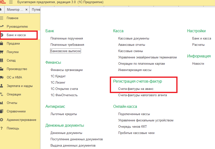 Помощник Регистрация счетов-фактур на аванс находится в разделе Банк и касса в разделе Регистрация счетов-фактур.