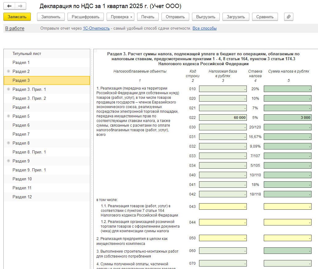 Декларация по НДС при отчете за первый квартал для организаций, применяющих УСН с пониженной ставкой НДС, будет иметь разделы: