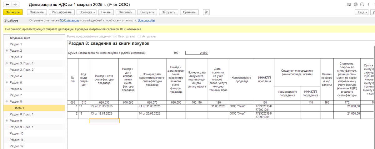Как мы уже упоминали, декларацию по НДС необходимо предоставлять в налоговый орган в электронном виде. В программе 1С:Бухгалтерия предусмотрена отправка декларации по телекоммуникационным каналам связи (ТКС) с помощью сервиса 1С-Отчетность.