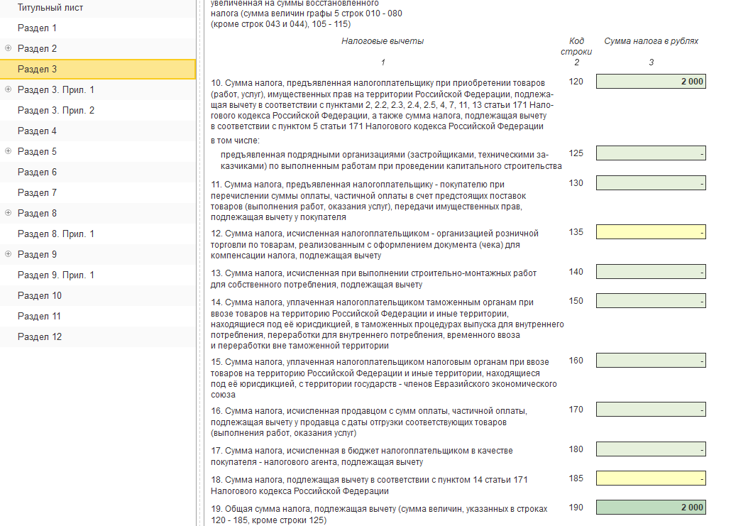 В пунктах 12-19 Раздела 3 декларации по НДС указываются суммы налоговых вычетов.