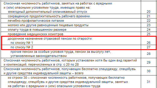 Строки 26-27 заполняются данными штатной позиции, которую занимает работник, если для нее предусмотрено право досрочного назначения пенсии.