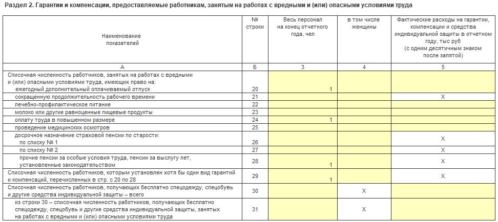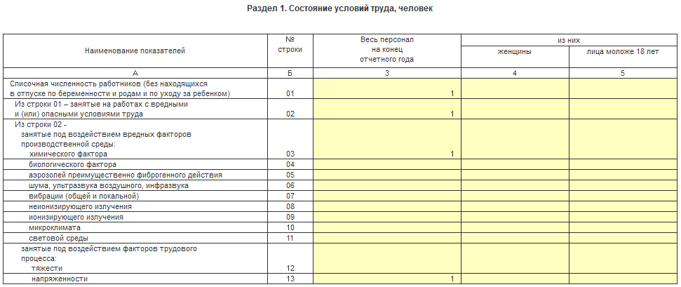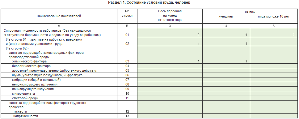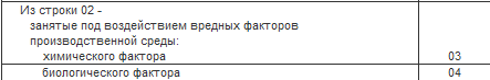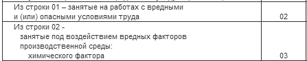 Строки 02 и 03 заполняются по результатам специальной оценки рабочих мест (СОУТ). В строке 02 указывается количество рабочих мест с третьим и четвертым классами вредности – "вредным" и "опасным".