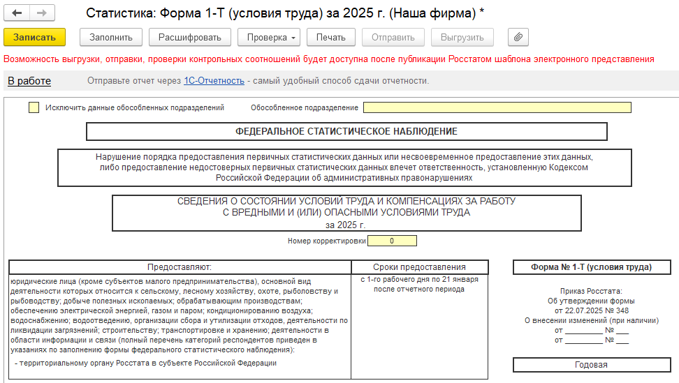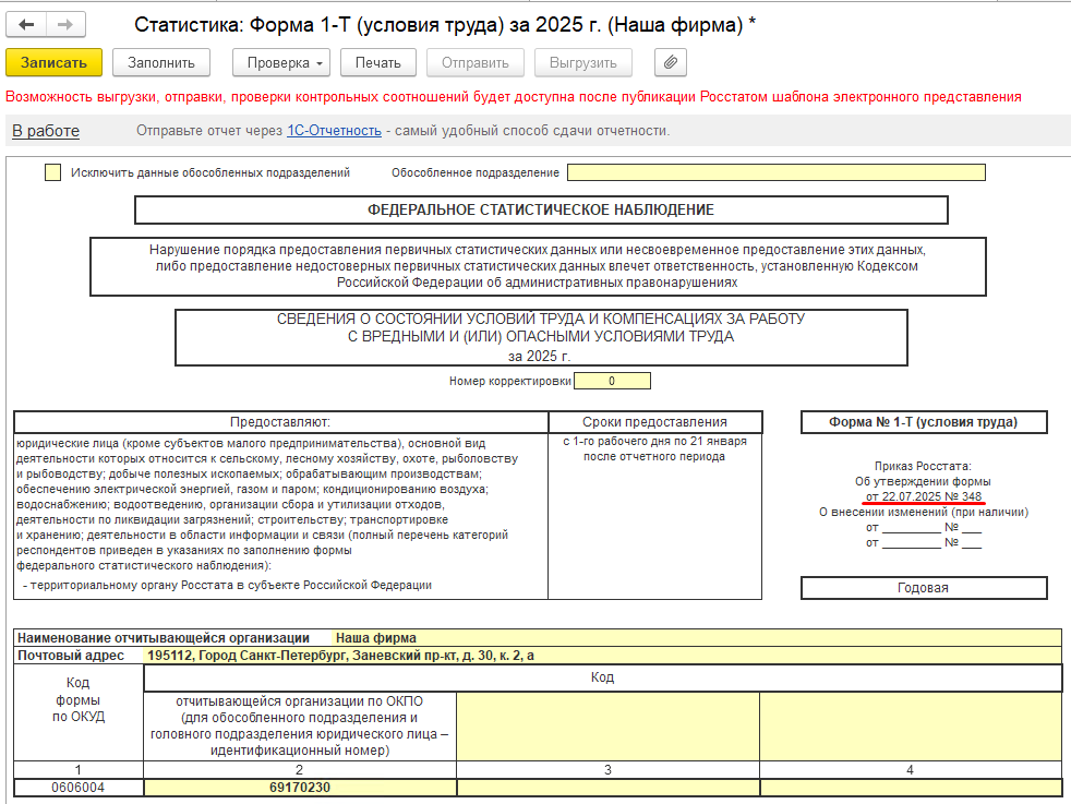 Таким образом, при наличии данных в программе, новая форма № 1-Т (условия труда) может быть заполнена автоматически и своевременно передана в Росстат.