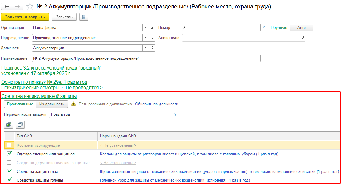 Указанное рабочее место проходит обязательную спецоценку (СОУТ), по данным которой присваивается класс условий труда, определяются вредные факторы, нормы выдачи СИЗ и другие параметры.