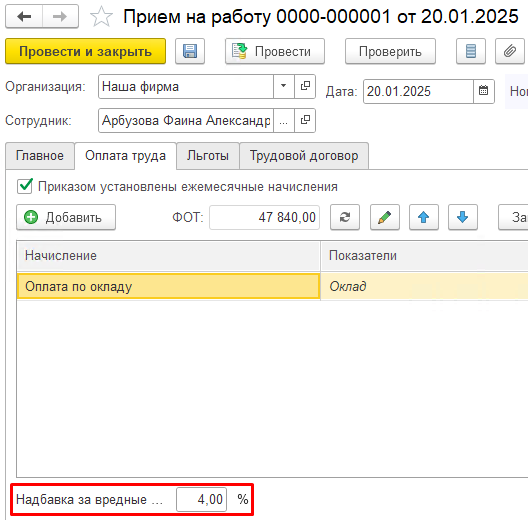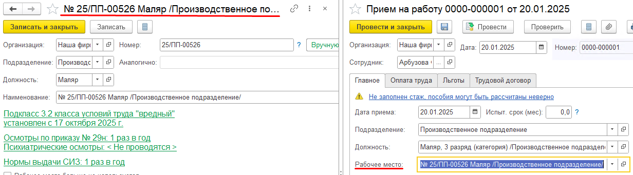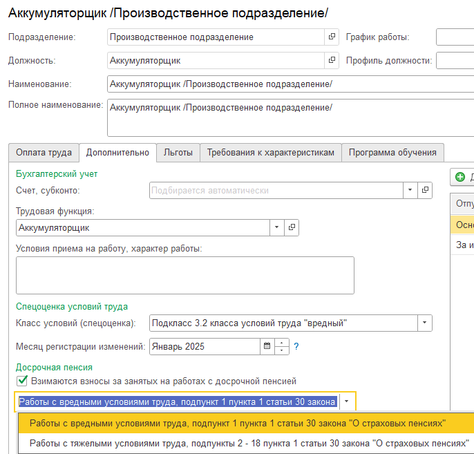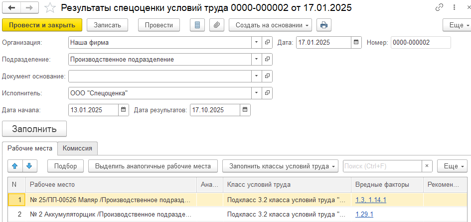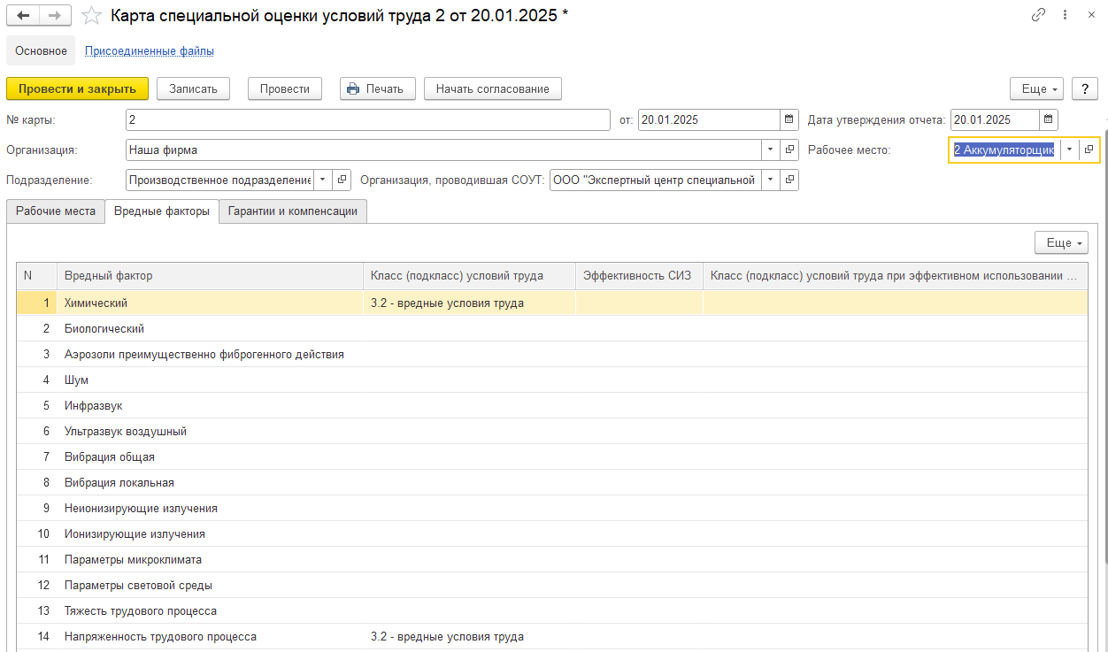На примере ниже рабочему месту присвоен "вредный" класс условий труда 3.2. Данные по работникам, числящимся на "вредных" рабочих местах, автоматически попадают в строку 02 статистической формы 1-Т "Условия труда".