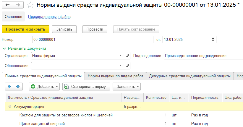 Строки 30-31 заполняются по данным выдачи СИЗ. При наличии в системе документа, регистрирующего нормы выдачи средств на позицию работника, данные автоматически заносятся в форму.