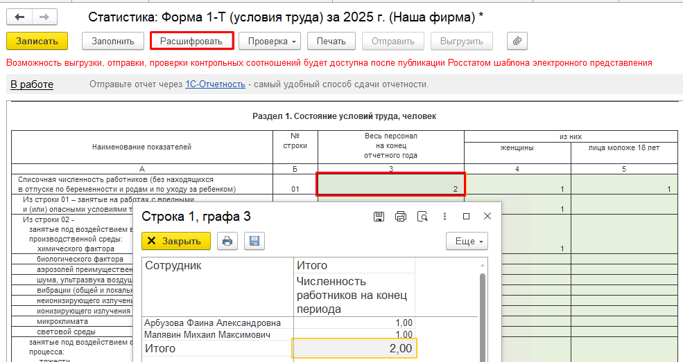 Проверить корректность заполнения данных в статистической форме можно по кнопке "Расшифровать". Система откроет вспомогательный отчет, в котором будет отражено, на основании какой информации выполнено заполнение той или иной ячейки отчета.