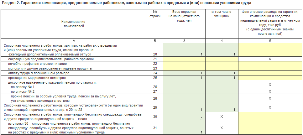 Первый раздел "Состояние условий труда, человек" заполняется автоматически данными из системы 1С:ЗУП КОРП. На скриншоте мы видим зеленые заполненные ячейки: