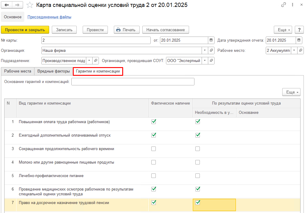 Данные для заполнения второго раздела формы 1-Т тоже содержатся в картах специальной оценки условий труда, на закладке "Гарантии и компенсации" – строки 20-29 документа.