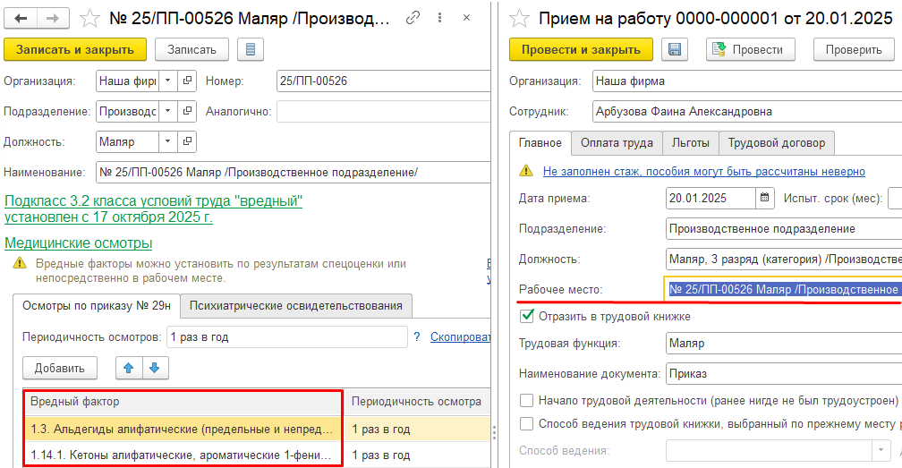 В карточке рабочего места указываются выявленные вредные факторы. Их перечень отображается в разделе "Медицинские осмотры". На основании этих данных автоматически заполняются строки отчета 1-Т, начиная с 03.