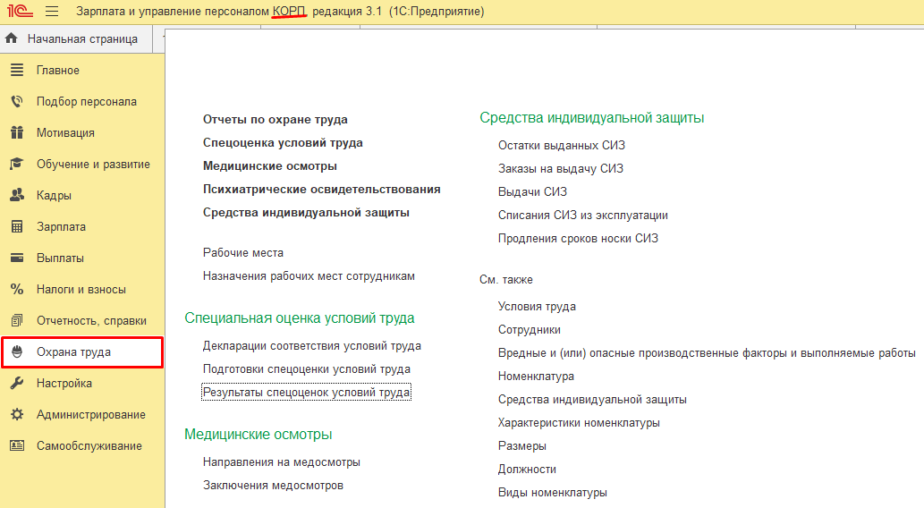 Средним предприятиям для учета охраны труда хватает типового функционала 1С:ЗУП КОРП. Крупные предприятия или предприятия с ярко выраженной отраслевой спецификой автоматизирует деятельность по охране труда в специализированных решениях – на базе линейки "1С:Производственная безопасность".