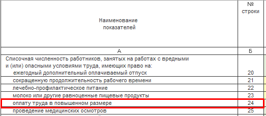 В строку 24 попадает информация о численности работников, которым назначена надбавка за работу во вредных условиях. Данное право тоже регистрируется кадровыми приказами.