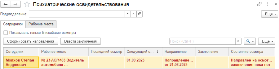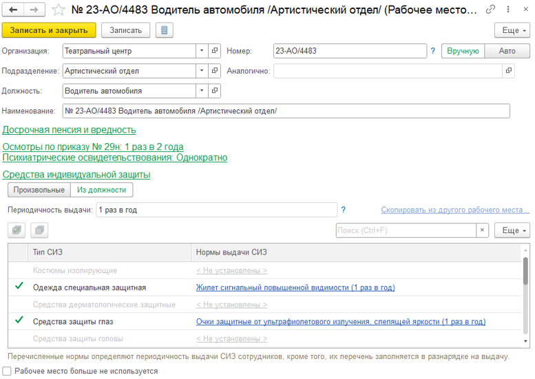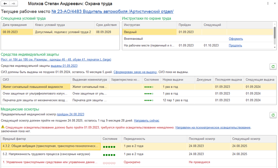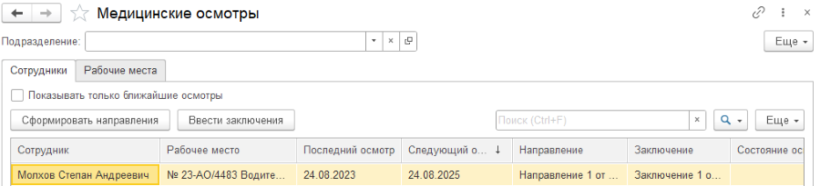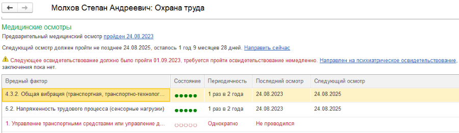 Если по результатам СОУТ в 1С:ЗГКУ зафиксировано наличие вредных факторов и видов работ, то в карточке рабочего места в системе будут отражены необходимые медицинские осмотры и психиатрические освидетельствования.