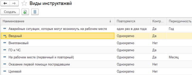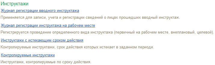 В части инструктажей по охране труда предусмотрен контроль и учет инструктажей различной периодичности для разных рабочих мест и печать журналов регистрации инструктажей. Разновидности инструктажей описываются в справочнике "Виды инструктажей". По умолчанию в нем содержатся: