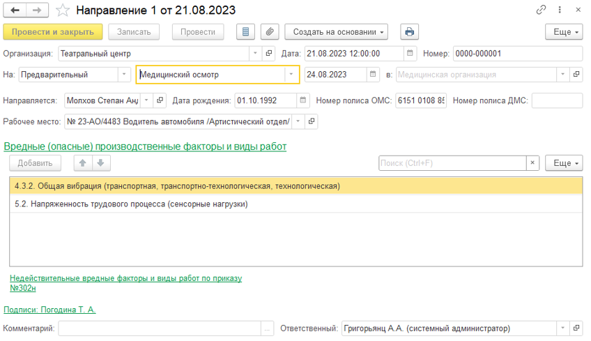 Документ "Направление на медосмотр" может быть оформлен как для сотрудника, так и для кандидата. При выборе рабочего места в нем автоматически заполняются зафиксированные по результатам СОУТ вредные факторы. Из документа можно сформировать печатную форму.