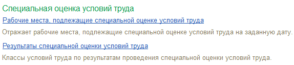 В системе содержатся отчеты, которые позволяют посмотреть результаты прохождение СОУТ и сформировать список рабочих мест, подлежащих спецоценке. Отчет "Рабочие места, подлежащие специальной оценке условий труда" можно создавать будущей датой, чтобы заранее запланировать необходимые мероприятия и бюджет.