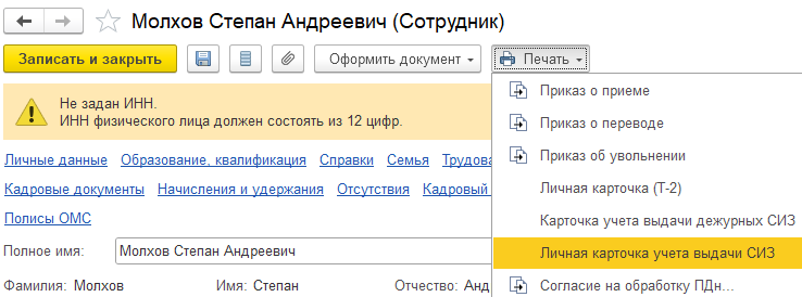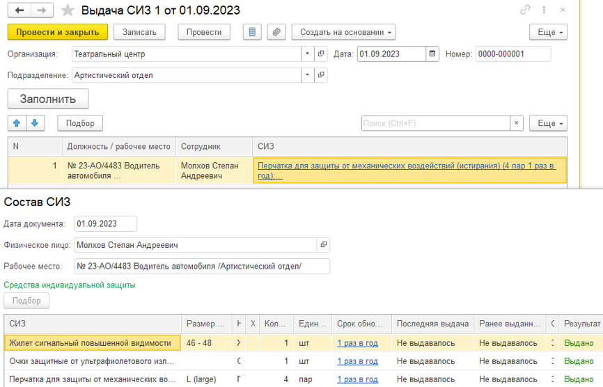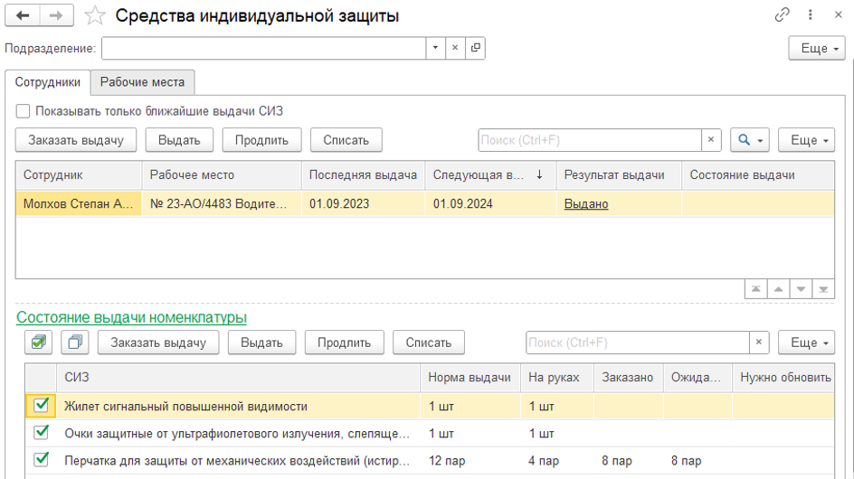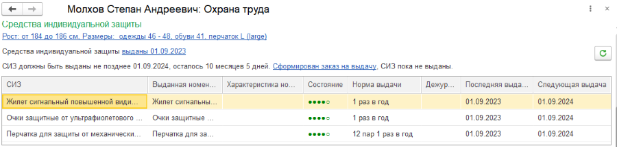 В карточке сотрудника в 1С:ЗКГУ есть раздел выдачи СИЗ, в котором отображаются: