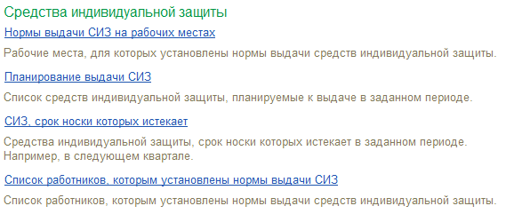 Здесь также предусмотрен специализированный комплект отчетов – для анализа информации по обеспеченности сотрудников необходимыми СИЗ.