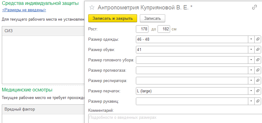 Если необходимо размер в размер подбирать СИЗ для сотрудника, в 1С:ЗКГУ можно внести все необходимые данные. Форма ввода открывается через гиперссылку "Размеры не введены".