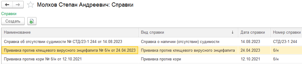 В 1С:ЗКГУ можно вести учет проведенных профилактических прививок. Информация о них регистрируется документом "Справка", а сводные сведения по прививкам всех сотрудников доступны в отчете "Справки сотрудников".