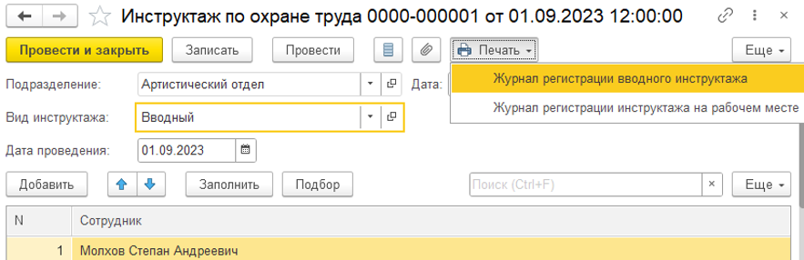 Для регистрации факта проведения инструктажа предназначен документ "Инструктаж по охране труда". В документе заполняется вид инструктажа, дата его проведения и список сотрудников, которые прошли инструктаж. Сотрудники могут быть заполнены автоматически.