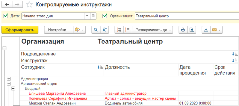 В отчет "Контролируемые инструктажи" выводятся последние даты проведения инструктажей по сотрудникам, а также сроки действия инструктажей. Данные отображаются в разрезе подразделений и видов инструктажей.
