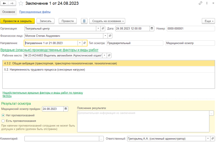 На основании "Направления" создается документ "Заключение" с результатами проведенных медосмотров. От даты проведения медосмотра рассчитывается срок его повторного проведения.