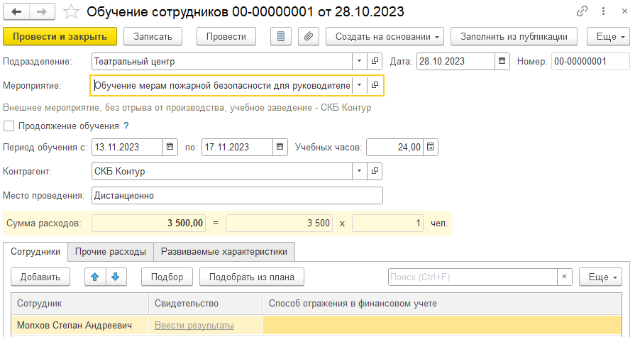 Обучение сотрудников может проводиться как по плану, так и непосредственно при возникновении потребности в обучении. Для регистрации факта проведения обучения предназначен документ "Обучение и развитие сотрудников". В нем указываются параметры проводимого обучения, участники, расходы, а также развиваемые в ходе обучения компетенции.