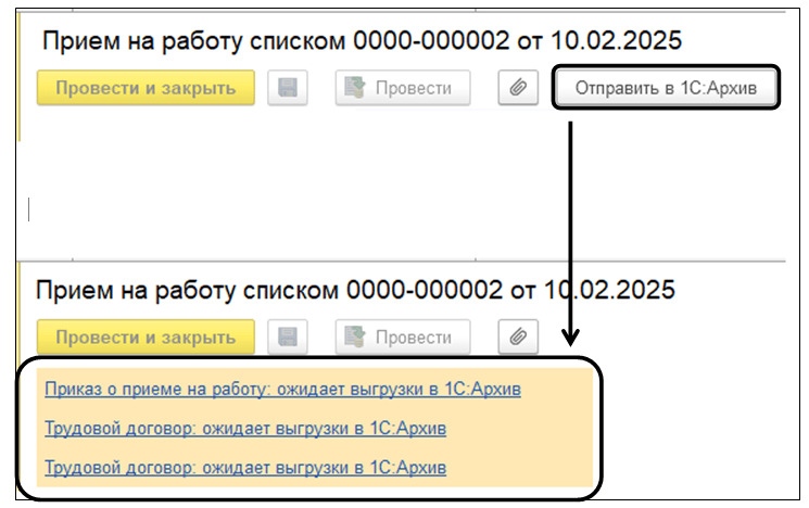 После настройки интеграции документы, созданные в 1С:ЗУП или 1С:ЗКГУ (например, приказы, карточки, справки), автоматически передаются в 1С:Архив.