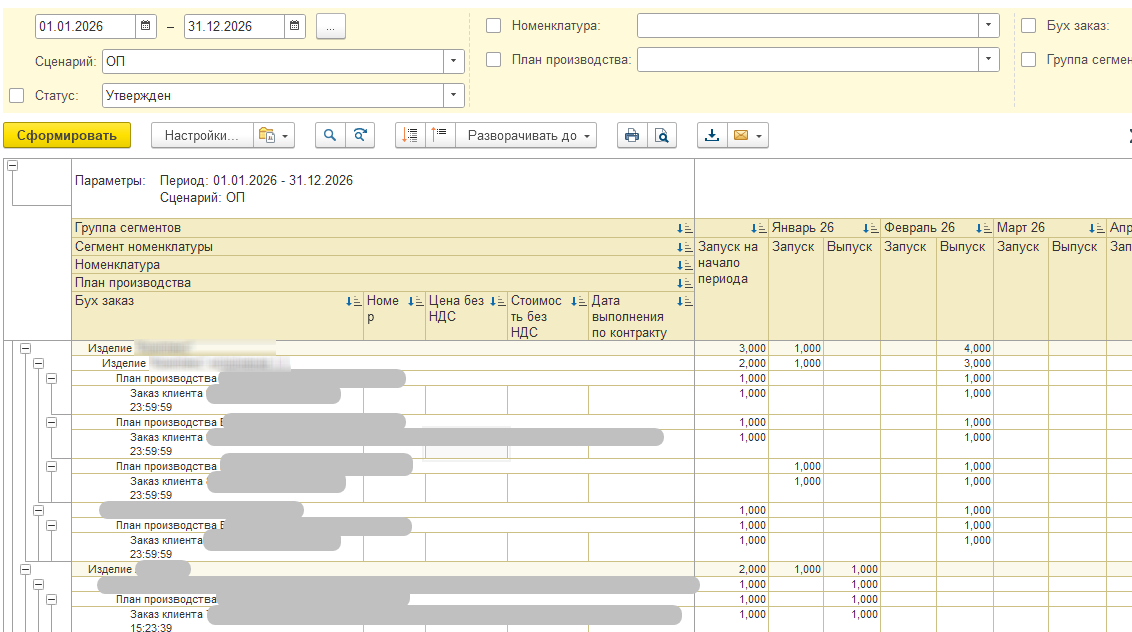 Таким образом выполняется создание "Плана производства" по каждому контракту. Он привязан к "Заказу клиента" и расписан по месяцам с указанием даты запуска и даты выпуска – такая форма была нужна заказчику.