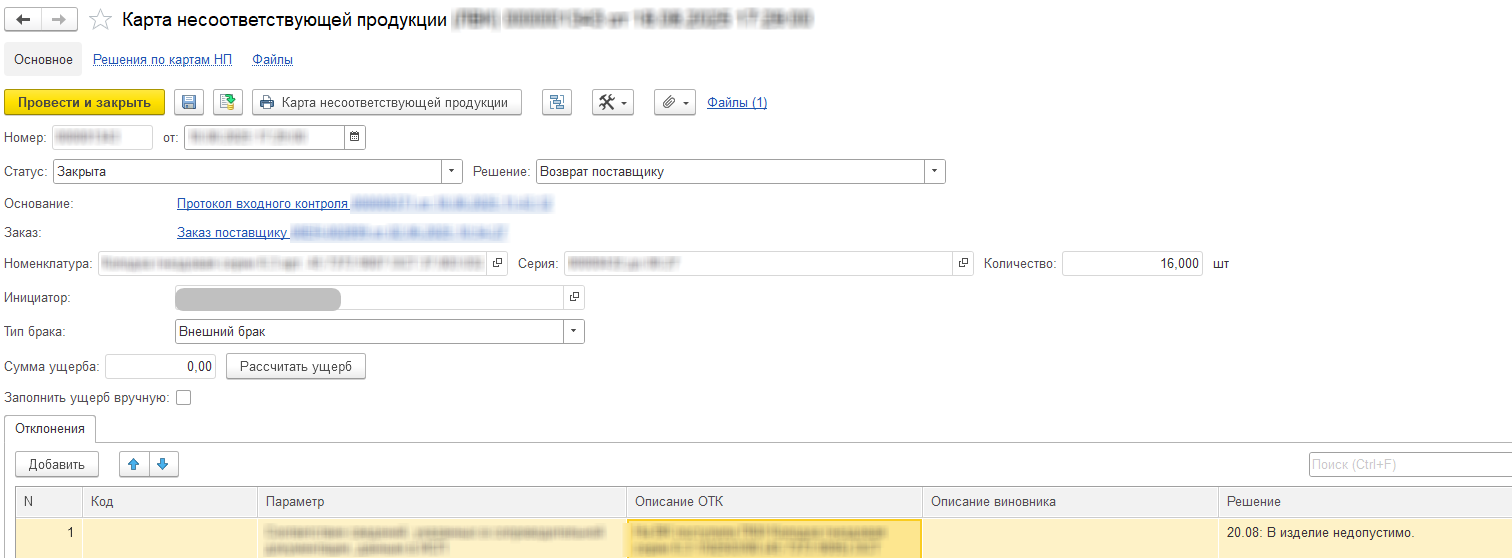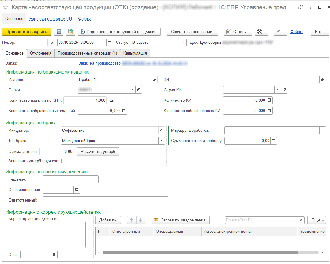 При выявлении несоответствия автоматически формируется карта несоответствия продукции. По ней можно указать вид брака, выполнить расчет ущерба на основе плановой калькуляции изделия, добавить дополнительные затраты и зафиксировать корректирующие действия. Документ распечатывается и передается по ответственным службам.