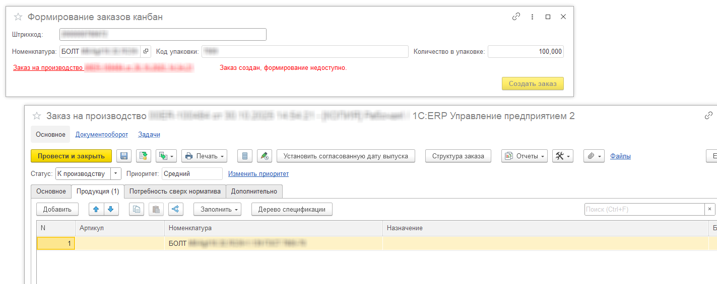 Если позиция производственная, формируется производственный канбан, то есть заказ на производство;