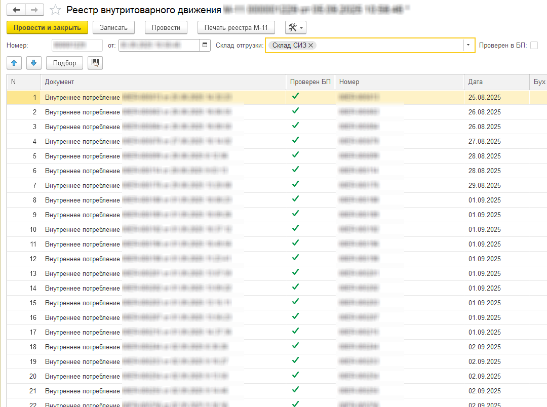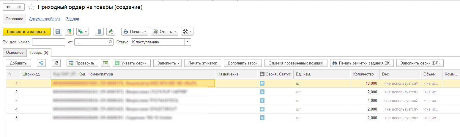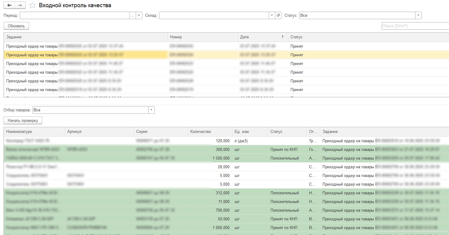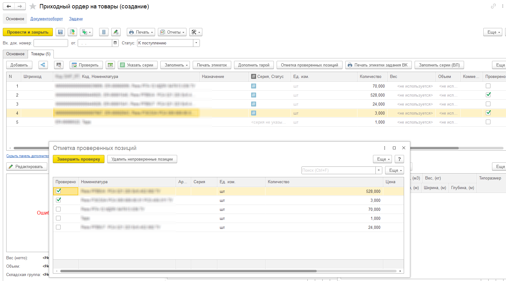 Поскольку предприятие работает с госконтрактами, позиции при приемке было необходимо разбивать по каждому контракту, что усложняло проверку их фактического количества и цен. Для решения этой задачи было разработано отдельное окно контроля, где позиции отображается в совокупности – без разбивки по контрактам.
