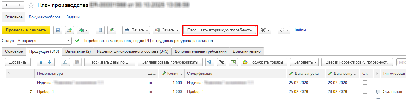 На основании утвержденного "Плана производства" выполняется расчет вторичной потребности;