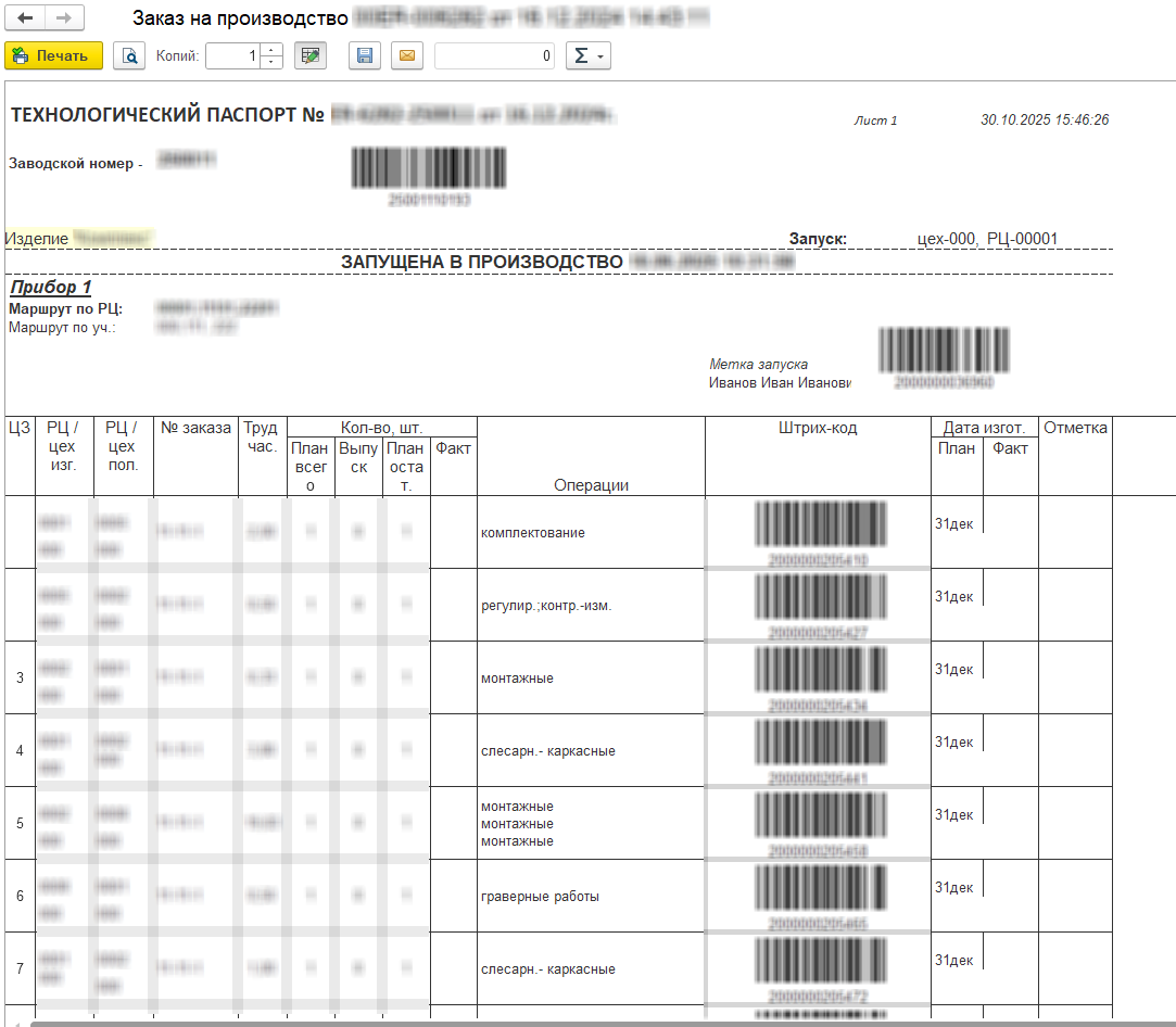 Работник цеха, выполняя операции, подходит к рабочему стенду, авторизуется и последовательно сканирует штрихкоды. Таким образом в 1С:ERP фиксируется выполнение технологических операций, а в сопроводительной карте отображается актуальный статус изготовления изделия. При необходимости карту можно распечатать повторно и увидеть текущее состояние каждой детали.