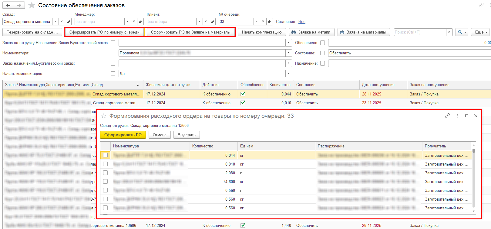 Диспетчер выбирает нужные позиции из очереди и передает их на комплектацию кладовщику. В расходном ордере они отображаются в разрезе очереди, что позволяет комплектовать материалы в точном соответствии с планом производства.