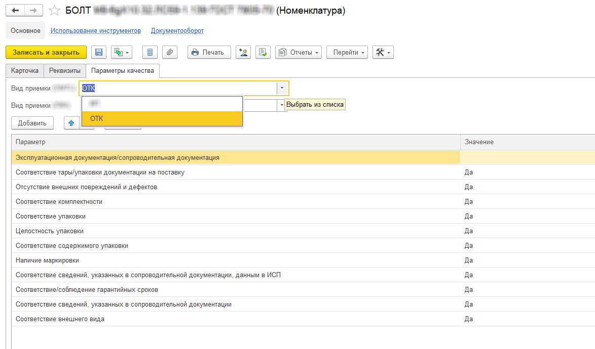 Для входного контроля в 1С:ERP разработан дополнительный функционал. В систему внесены параметры контроля, обязательные для каждой номенклатурной позиции, а также отметки о необходимости проверки ОТК или военной приемки.