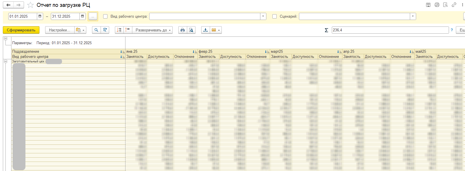 На основании этих документов в 1С:ERP можно построить "Отчет по загрузке рабочих центров" и посмотреть, сколько центров занято, сколько доступно, а сколько можно ещё дозагрузить.