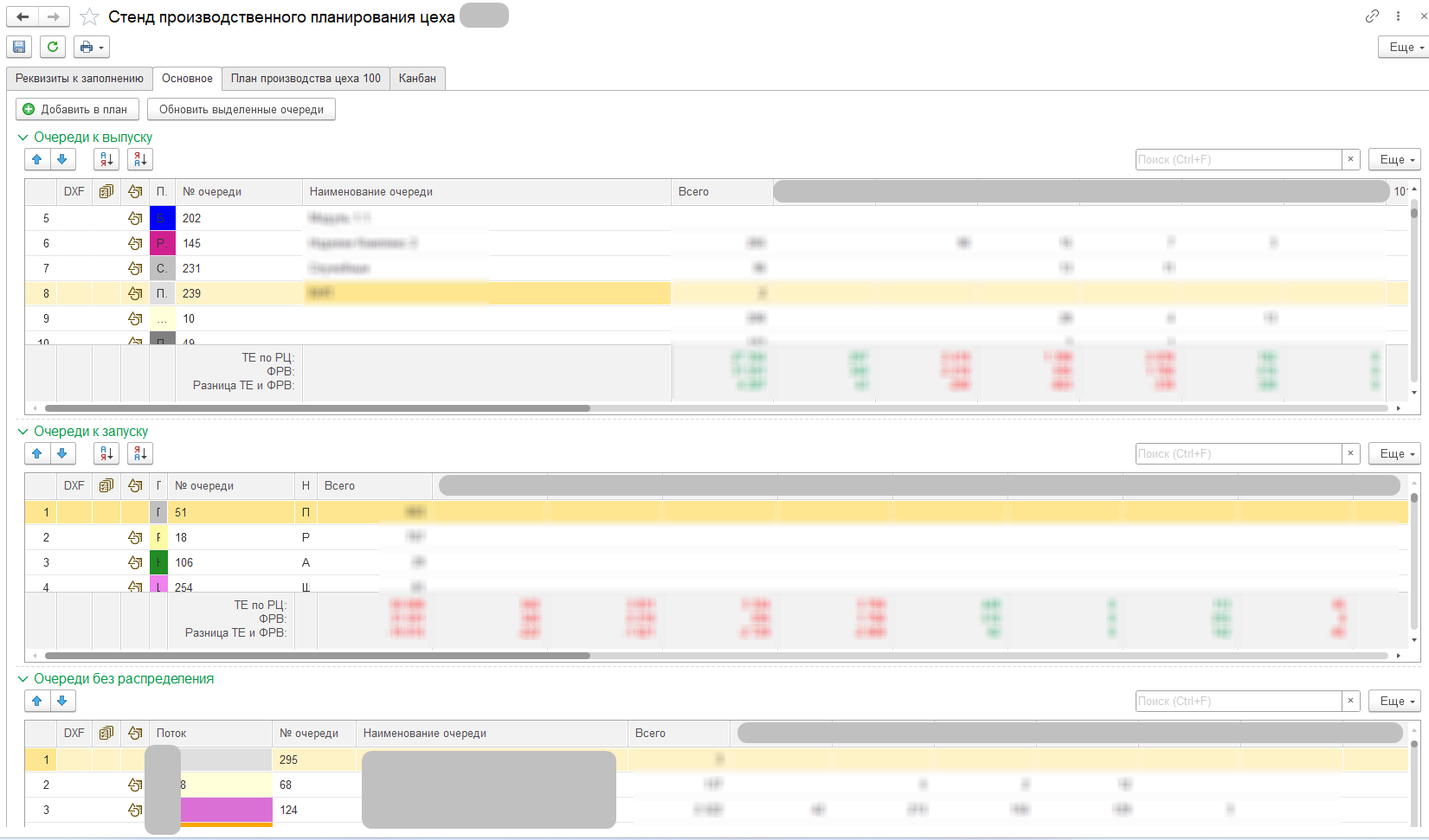 В рабочем месте "Стенд производственного планирования" отображаются очереди, рабочие центры, загрузка рабочих центров. Пользователи видят, какие очереди распределены в производство, какие ещё не распределены, и могут этим гибко управлять – в зависимости от приоритетов и наличия ресурсов.