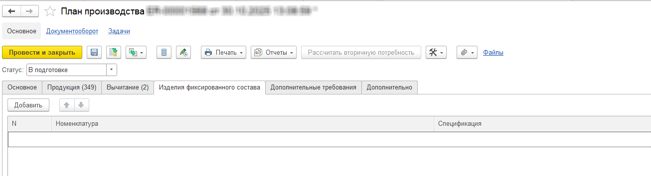 Поскольку в "План производства" могут вноситься различные изменения, доработана возможность фиксации состава изделия. Эта доработка называется "Изделия фиксированного состава". Сделана она для того, чтобы система запоминала, по какой спецификации и по какому составу мы работаем с изделием, потому что версии полуфабрикатов могут меняться, а при пересчете плана производства необходимо использовать первоначальную спецификацию.