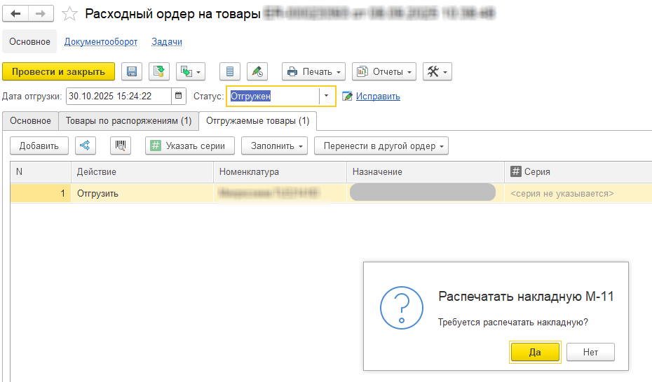 После завершения комплектации кладовщик ставит статус "Отгружен", а система автоматически формирует накладную – остается только распечатать документ. Пользователю не требуется переходить в другие рабочие места или выполнять дополнительные операции.