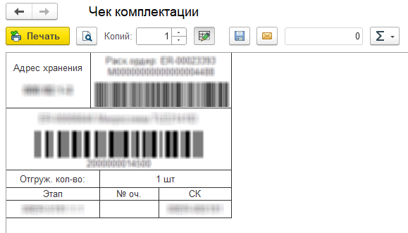 Для удобства работы кладовщиков реализован чек комплектации. Кладовщик подходит к рабочему месту, сканирует документ, затем номенклатуру, после чего система подтверждает, что позиция скомплектована.