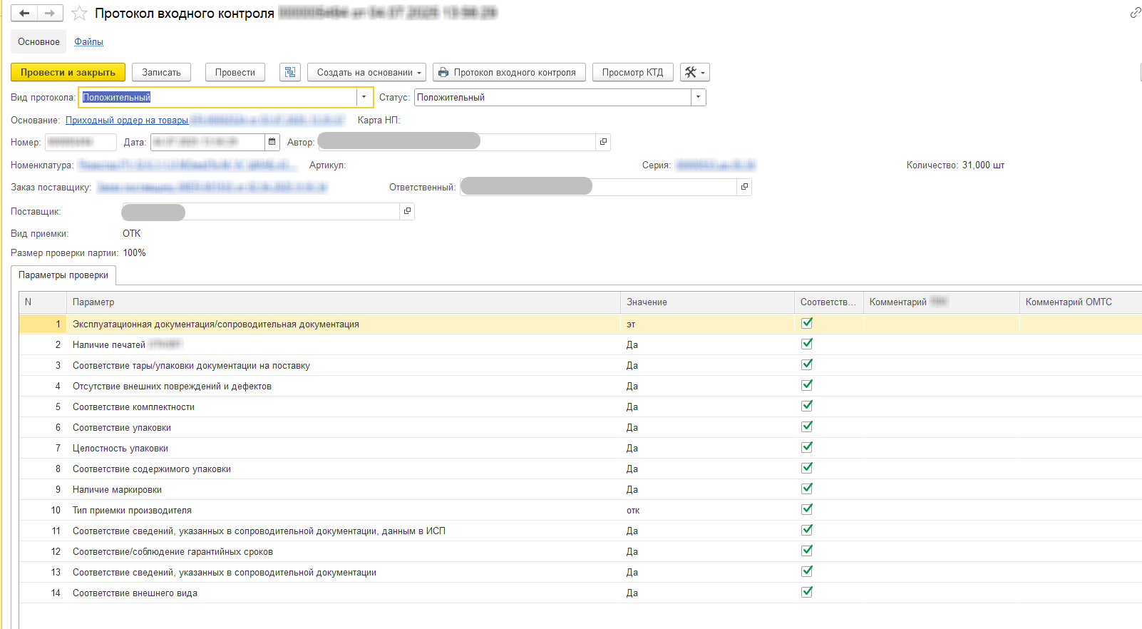 По каждой позиции формируется протокол входного контроля с результатами проверки по параметрам и возможными комментариями.