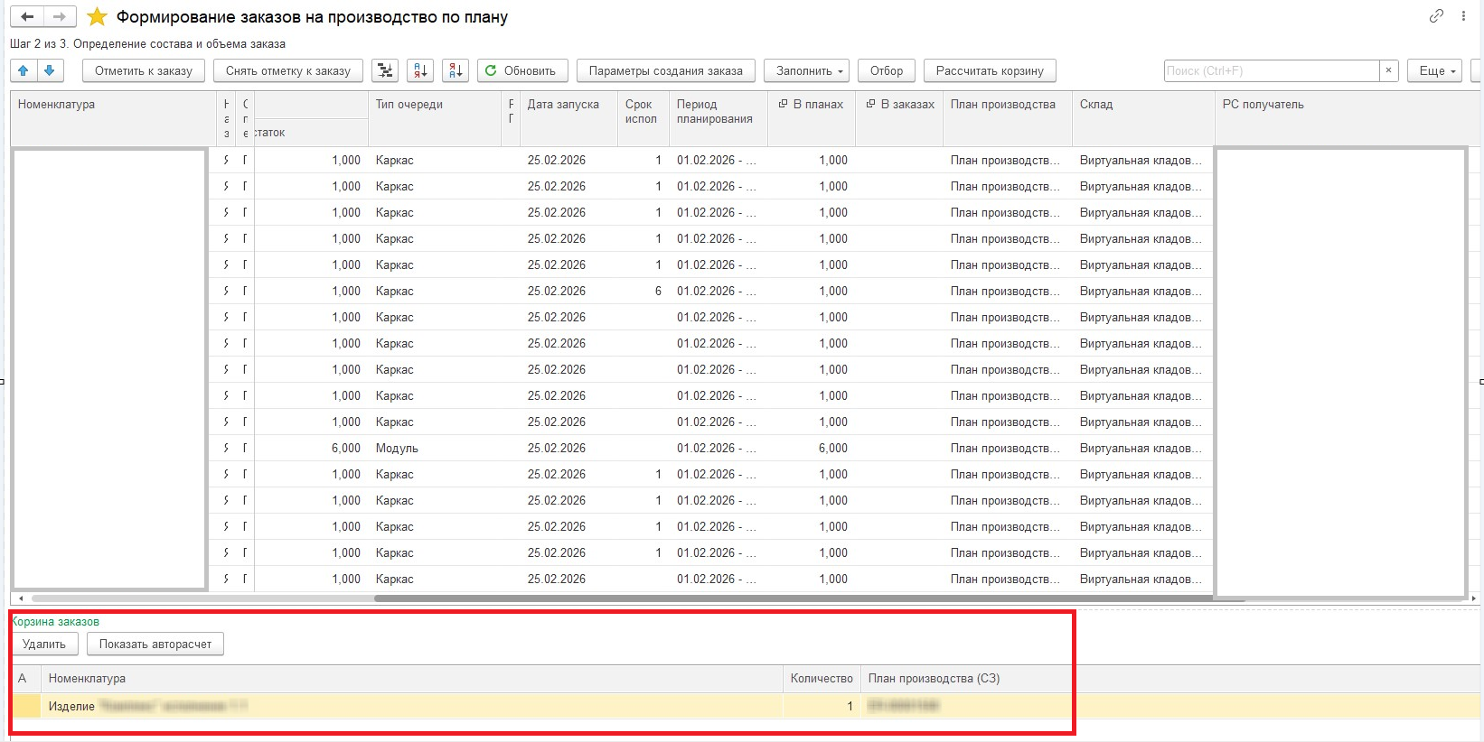 В рабочем месте "Формирование заказов на производство по плану" доработан функционал корзины заказов. В корзину заказа можно добавить определенный блок, например, модуль, и выполнить его расчет. Тогда система автоматически заполнит все переделы, которые относятся к модулю. Данный функционал позволяет выполнить формирование заказов только на конкретный блок, не затрагивая то, что пока не запускается в работу.