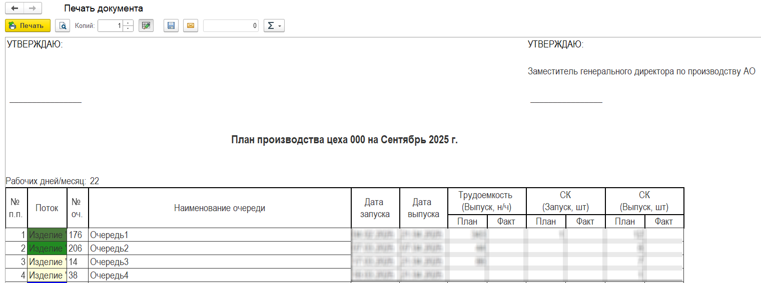 Под требования заказчика была разработана печатная форма для утверждения плана производства цеха металлозаготовки.