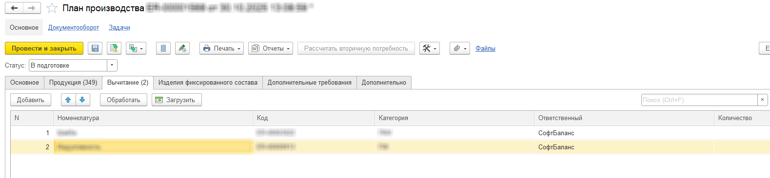 Вычитание позволяет исключить полуфабрикат, блок или покупную позицию. Если мы вычитаем полуфабрикат, то из блока "Продукция" вычитается как сам этот блок, так и все входящие в него переделы. То есть у нас может быть какой-то крупный блок, который включает объемное дерево изделий – на несколько сотен полуфабрикатов, по этой команде мы можем весь его вычесть из плана производства. И можем потом, при необходимости, добавить.