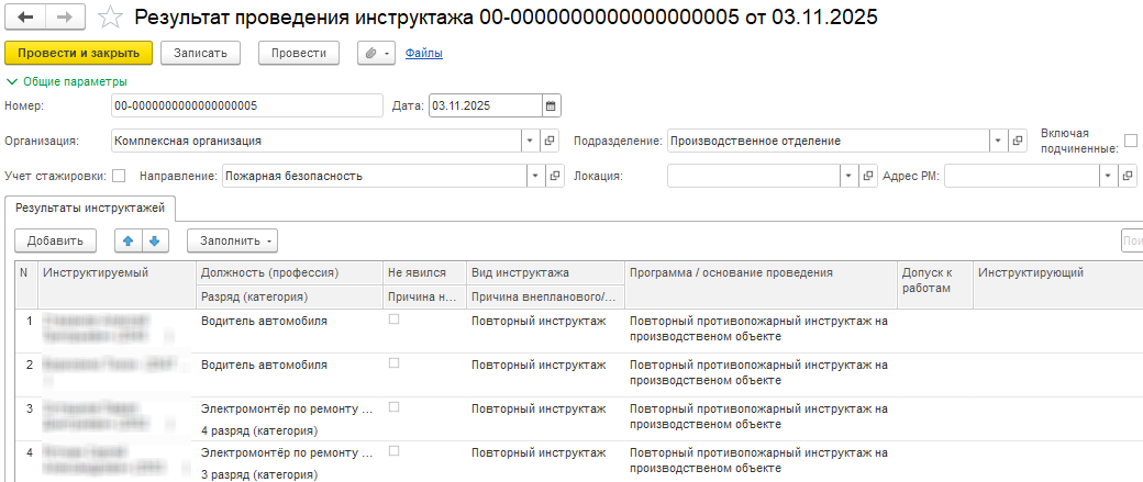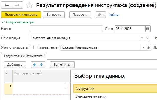 Факт проведения противопожарных инструктажей в "1С:Производственная безопасность" регистрируется документом "Результат проведения инструктажа".