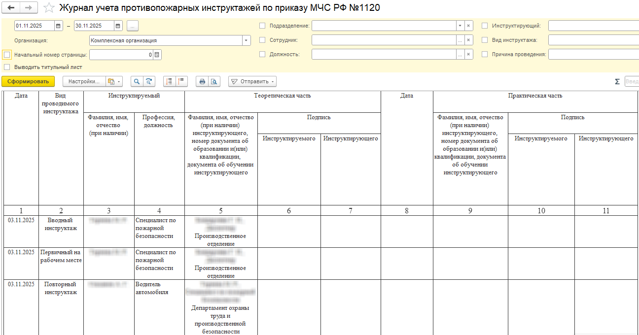 Это значительно ускоряет формирования списка инструктируемых, а также позволяет автоматически формировать журнал учета противопожарных инструктажей, форма которого соответствует Приказу МЧС № 1120.