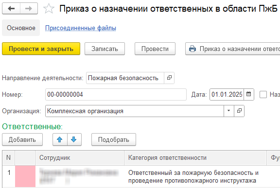Назначение ответственных за пожарную безопасность в системе "1С:Производственная безопасность" регистрируется приказом. При выборе категории ответственности происходит автоматическая проверка прохождения обязательных программ обучения, т.е. для каждой категории ответственности в системе указывается перечень обязательных программ обучения. Для наглядности результат проверки выделяется цветом.