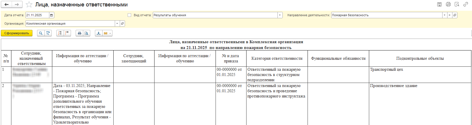Для получения общего списка назначенных ответственных предусмотрен отчет "Лица, назначенные ответственными". В нем выводятся назначенные сотрудники с указанием подконтрольных объектов и информацией о пройденных обучениях и инструктажах.